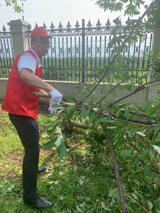 圖為志愿者合影 8月13日上午,該所志愿服務(wù)隊(duì)身穿統(tǒng)一紅色馬甲,積極投身到災(zāi)后恢復(fù)工作中。 “把砍刀給我,我力氣大,讓我來(lái)。” 活動(dòng)過(guò)程中,孫明偉、杜廣勝、楊堅(jiān)等同志一行先查看了配電房周邊綠化帶,看到有樹木倒伏,壓在防護(hù)網(wǎng)上,存在較大安全隱患,他們二話不說(shuō)立即手拿砍刀,對(duì)樹木進(jìn)行切割處理,并由李學(xué)平、包德福等人安排拉車將斷木等清理干凈。