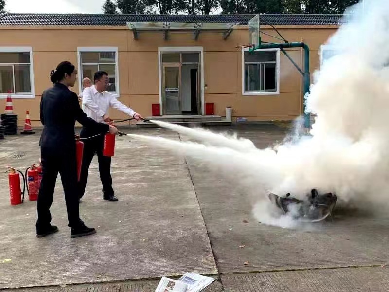 圖為滅火器演練現場 演練現場,老員工們按照“一看二搖三拔四噴”的使用方法,熟練地檢查了滅火器有無過期,隨后搖動瓶身、拔出插銷,對著火源根部噴了下去,熊熊火勢瞬間被熄滅。