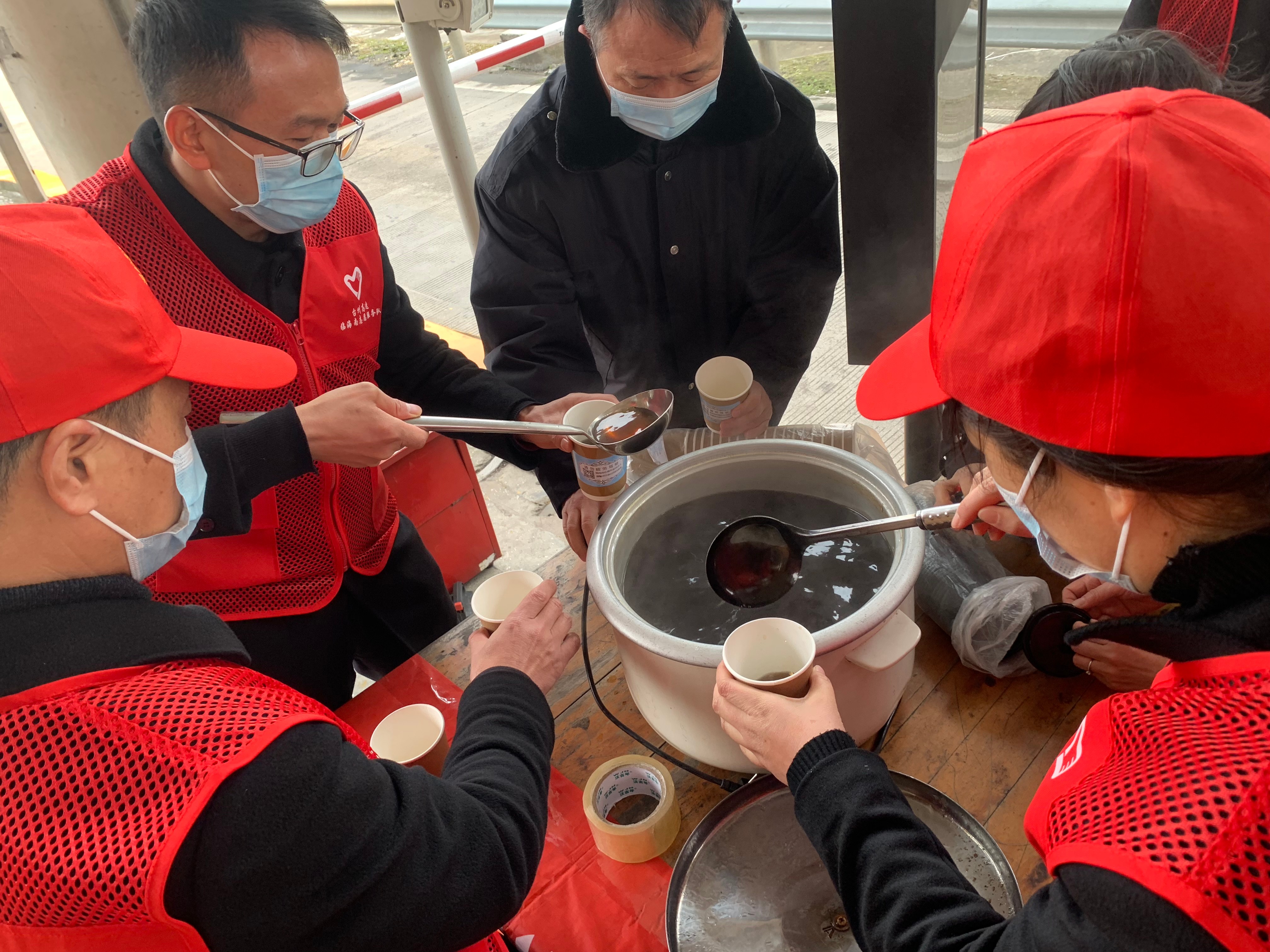 為了開展好本次活動,收費所黨支部提前一天就進行了布置,力求在做好疫情防控的同時開展好志愿服務活動。 當天上午,收費所食堂預先熬制好滿滿一大鍋紅棗姜茶,伴隨著鵝毛大雪,車道寒風凜冽,但刺骨的寒風擋不住志愿者們的似火熱情,大家身穿紅馬甲,面帶口罩,在搭好志愿服務臺后,有的負責用勺子把滾燙的茶水裝進紙杯,有的負責蓋杯蓋,有的負責傳遞,有的負責把裝好茶水的杯子送給駕駛員,現場有序分工。熱情的服務贏得過往司乘人員的好評。