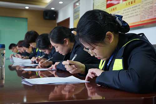 圖為搶答環(huán)節(jié) 現(xiàn)場問答氣氛熱烈,主持人接連提問,精彩的角逐引來現(xiàn)場陣陣掌聲,偶有答錯的大家一起來糾錯。在搶答中,各班組比分逐漸拉開,最終收費二班的郭斯泓、葉定嬌、周欲曉一組獲得現(xiàn)場問答環(huán)節(jié)第一名,同時收費二班在班組筆試中也名列第一。