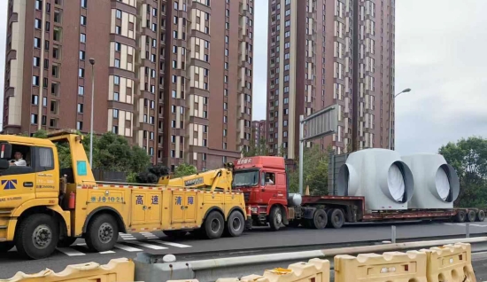圖為被施救車拖出的超限車 接到電話的第一時間,當班班長上報所領導,并丈量回復指揮中心出口超寬車道寬為4米,進口超寬車道地面寬為4.8米。經協調,超限車輛從臺州收費所入口車道下高速。副所長和班長隨即拆除內廣場的中央隔離帶,以便車輛可以通行。11:50分,交警攔住寧向出囗車,入口封閉。施救車拖著該車緩緩從入口車道開出。 經詢問得知,該車辦理了超限運輸車輛通行證,運載大型輪轂從樂清上高速去內蒙,結果行駛至臺州時,車子出了故障。該車車重84噸,原本需要繳納通行費695元,大件運輸優惠后僅需繳納395元。雖然車子壞了,但駕駛員依然向工作人員表示感謝,并感言合法裝載的好處,不然還要面臨處罰。入口封閉大概二十分鐘后,車道恢復通行。