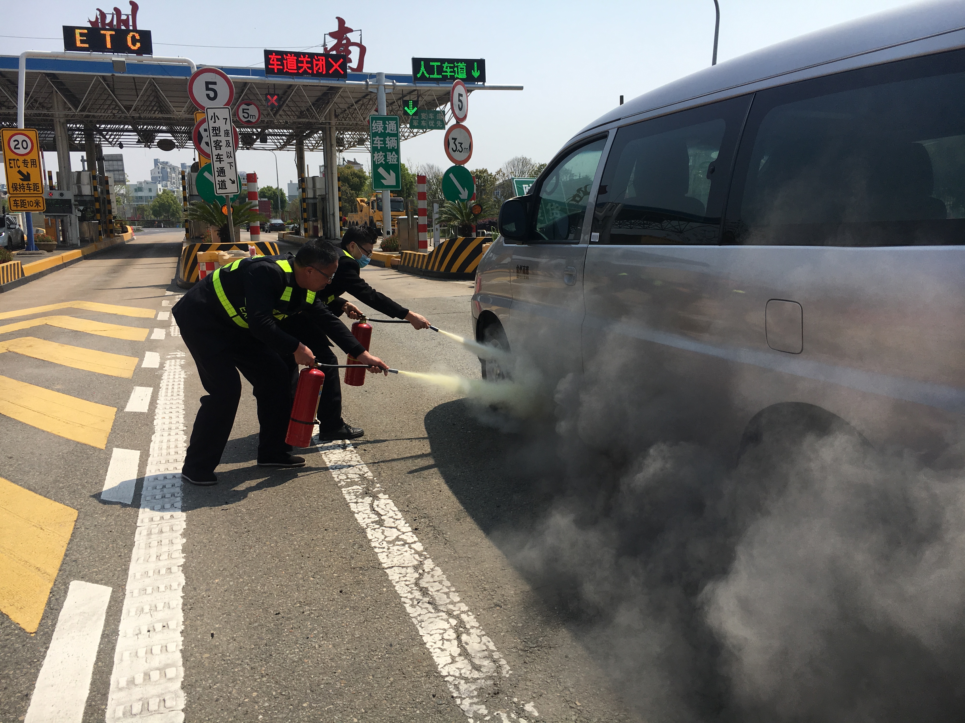 圖為交通事故應(yīng)急演練 在收費(fèi)廣場(chǎng)交通事故應(yīng)急預(yù)案演練中,該所模擬了汽車在收費(fèi)車道起火的交通事故。事故發(fā)生后,當(dāng)班班長(zhǎng)第一時(shí)間啟動(dòng)預(yù)案,將險(xiǎn)情報(bào)告監(jiān)控員,并立即關(guān)閉事故車道,組織人員對(duì)起火點(diǎn)進(jìn)行前期壓制,同時(shí)指揮人員擺放標(biāo)志,引導(dǎo)后續(xù)車輛,并快速放行。接到險(xiǎn)情報(bào)告的所長(zhǎng)、辦公室人員迅速趕到現(xiàn)場(chǎng)參與救援:女同志協(xié)助班組開足車道;部分男同志負(fù)責(zé)出入口車輛的疏導(dǎo)指揮工作;其余人員負(fù)責(zé)對(duì)火災(zāi)進(jìn)行撲滅……大家各司其職,快速處理險(xiǎn)情。