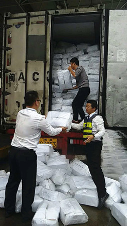 這輛滿載海鮮的綠農車,貨物掉滿車道,司機一人束手無策,當班班長陳豐平在拍完綠農照片后,叫上班員林葉輝,一起快速幫助司機一件一件地傳遞貨物。盡管每一袋貨物都十分重,但是他們為了幫助師傅提早整理貨物,顧不得臉上交織的汗水和雨水。