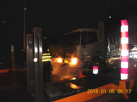 1月6日,一輛車牌為J52286的貨車著火,在收費員楊丹妮的應急救援下,成功控制住了火勢,沒有造成重大損失。