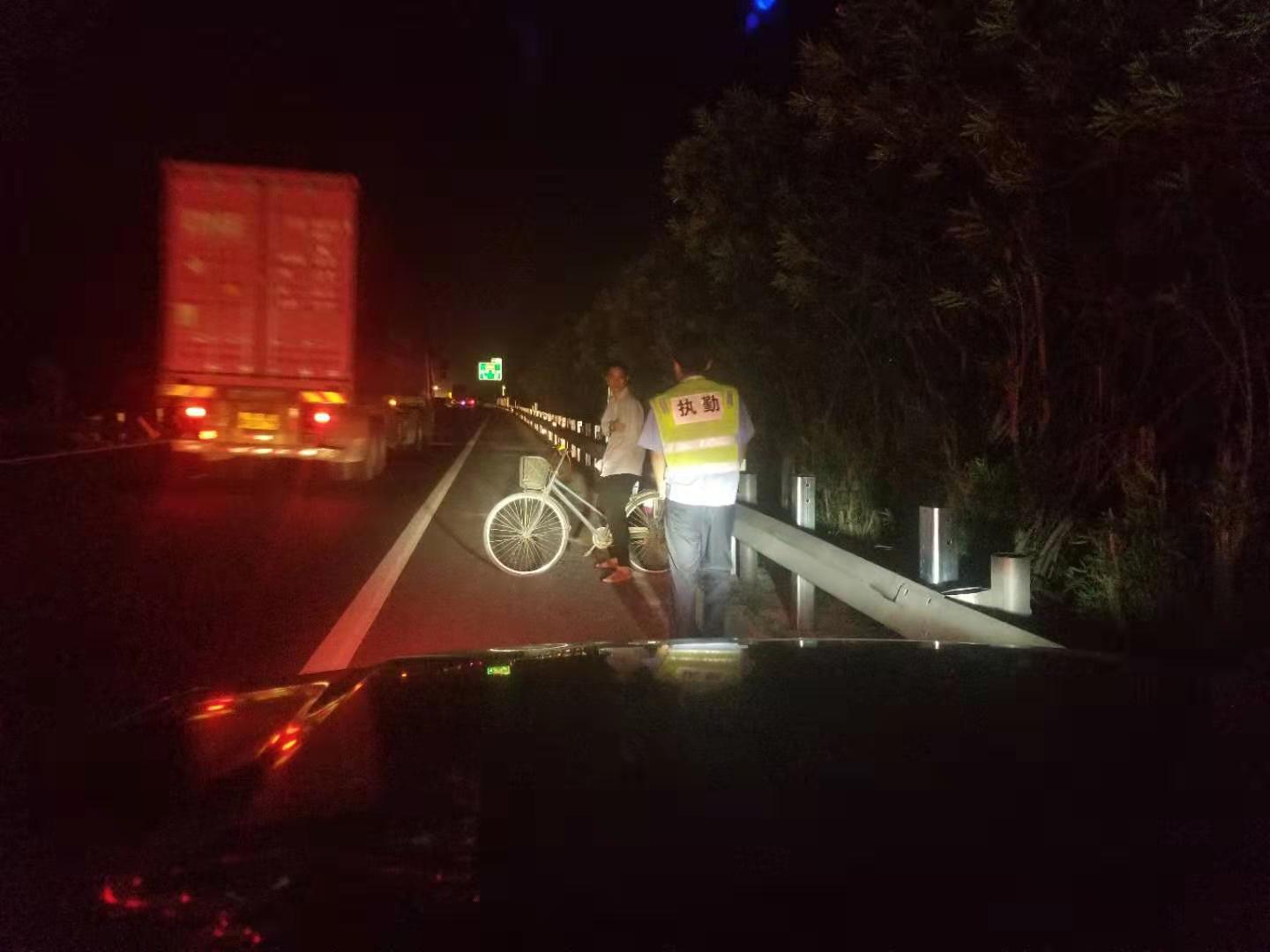 9242109,大溪嶺隧道所中控室發出通知。執勤隊員接中控指令,迅速出警。晚上九點,在高速公路上找人,需得打上12分的精神,巡邏車放慢車速,坐于后座的隊員們緊盯著車道兩旁,終于在2114分,距離寧向隧道出口一公里處發現該騎車男子,隊員們立即上前將其攔住。眼前的一幕令執勤隊員嚇出一身冷汗,該男子左手殘疾,單手騎車,晚上視線模糊,且高速公路車多,速度快,司機很難發現有行人,如發現躥出來的行人而采取緊急制動,會造成多起追尾事故,現場情況非常危險!隊員們合力將自行車抬上車。