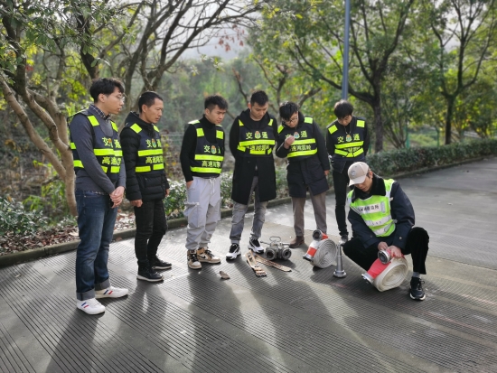 圖為陶文輝在教樂(lè)清公司員工如何進(jìn)行水帶操作 本次培訓(xùn)對(duì)隧道預(yù)警流程、二帶連接及執(zhí)勤隊(duì)在平時(shí)巡邏、預(yù)警、處理事故中如何確保自身安全等進(jìn)行重點(diǎn)講解。執(zhí)勤隊(duì)長(zhǎng)帶領(lǐng)隊(duì)員們?cè)诠芾硭賵?chǎng)進(jìn)行模擬主線卡口、事故拋錨車預(yù)警封道操作,樂(lè)清公司員工觀摩之后也進(jìn)行實(shí)際操作,孫鵬詳細(xì)講解擺放隔離錐應(yīng)注意事項(xiàng),每一隔離錐的間隔位置、巡邏車后方擺放的安全距離,事故處理之后,收隔離錐應(yīng)注意的安全動(dòng)作。陶文輝為樂(lè)清公司員工演示“二帶連接”,并對(duì)水帶的甩、接、收每一動(dòng)作盡可能詳細(xì)仔細(xì)地進(jìn)行解說(shuō)示范。