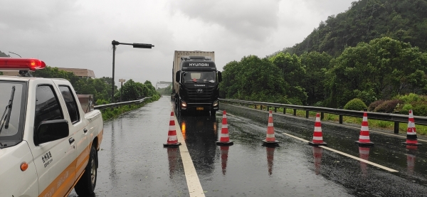 08:12分,接溫州交警通知,受臺(tái)風(fēng)影響,高速上很多車輛發(fā)生側(cè)翻事故,要求隊(duì)員們?cè)跍叵蛩淼揽谶M(jìn)行封道,隊(duì)員們接警后立即在洞口卡口預(yù)警。