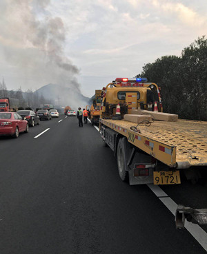 事態(tài)緊急,刻不容緩,清障車立即拉響警報預警,迅速提速超過事故車,指引該車轉入應急車道避免二次事故。由于該車運載易燃品,天氣晴好,火勢借東風迅速變猛,無法直接現(xiàn)場救援,事故車駕駛員已經(jīng)手忙腳亂。施救中心工作人員立即緊急上報指揮中心請求消防車支援。中心“2+1+n” 快速應急模式隨即馬上啟動,17:30分在中心待命的施救車也到達現(xiàn)場配合預警,保持事故現(xiàn)場另一車道暢通,不影響其他車輛安全通行。 17:40分消防車到達現(xiàn)場滅火,18:15火滅,清障車帶事故車離開現(xiàn)場。從發(fā)現(xiàn)到處置完畢僅1小時,無人員傷亡,高速公路也一直保持安全暢通。 童軍偉