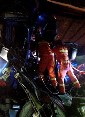 5分鐘后,兩輛紅藍(lán)警燈閃爍的施救車迅速飛至現(xiàn)場(chǎng)。此時(shí)現(xiàn)場(chǎng)多車損毀嚴(yán)重,尤其最后一輛大貨車駕駛室嚴(yán)重變形,司機(jī)受傷,胸部以下被車頭卡住無(wú)法動(dòng)彈,血水從門縫流出,現(xiàn)有設(shè)備無(wú)法有效救援,也無(wú)法知道有無(wú)生命危險(xiǎn)。