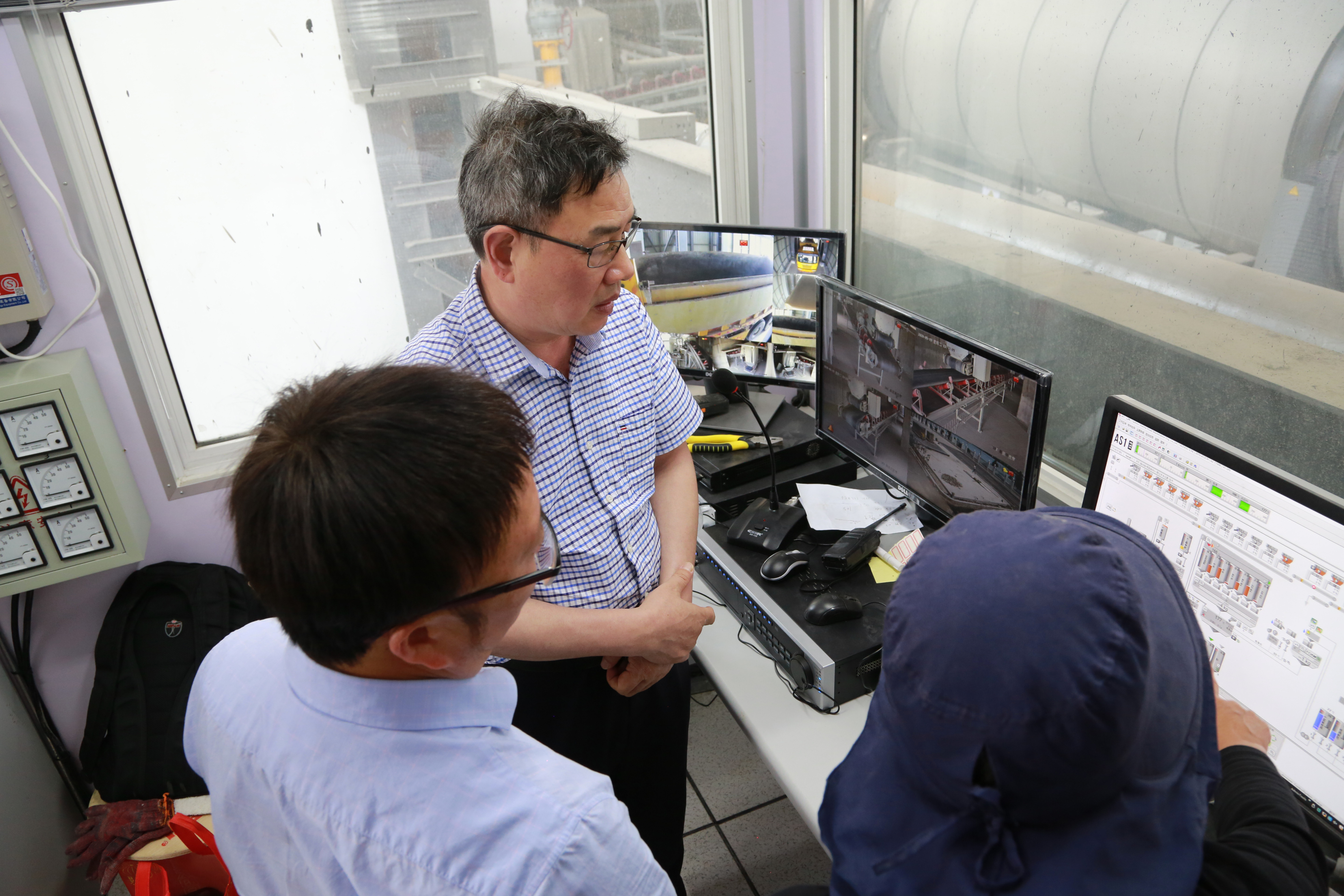 圖為陳文波一行在山海公司瀝青拌合站現場調研