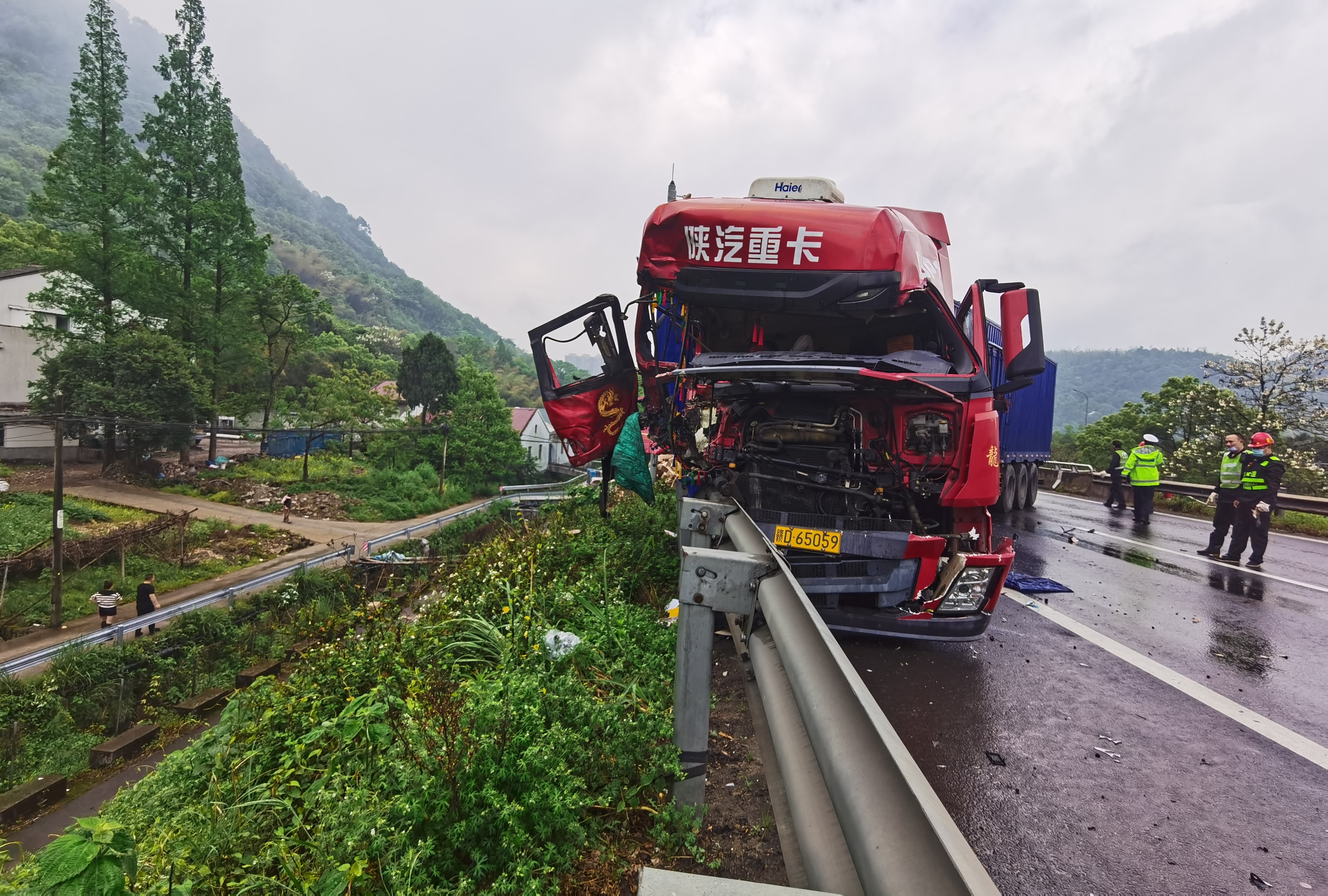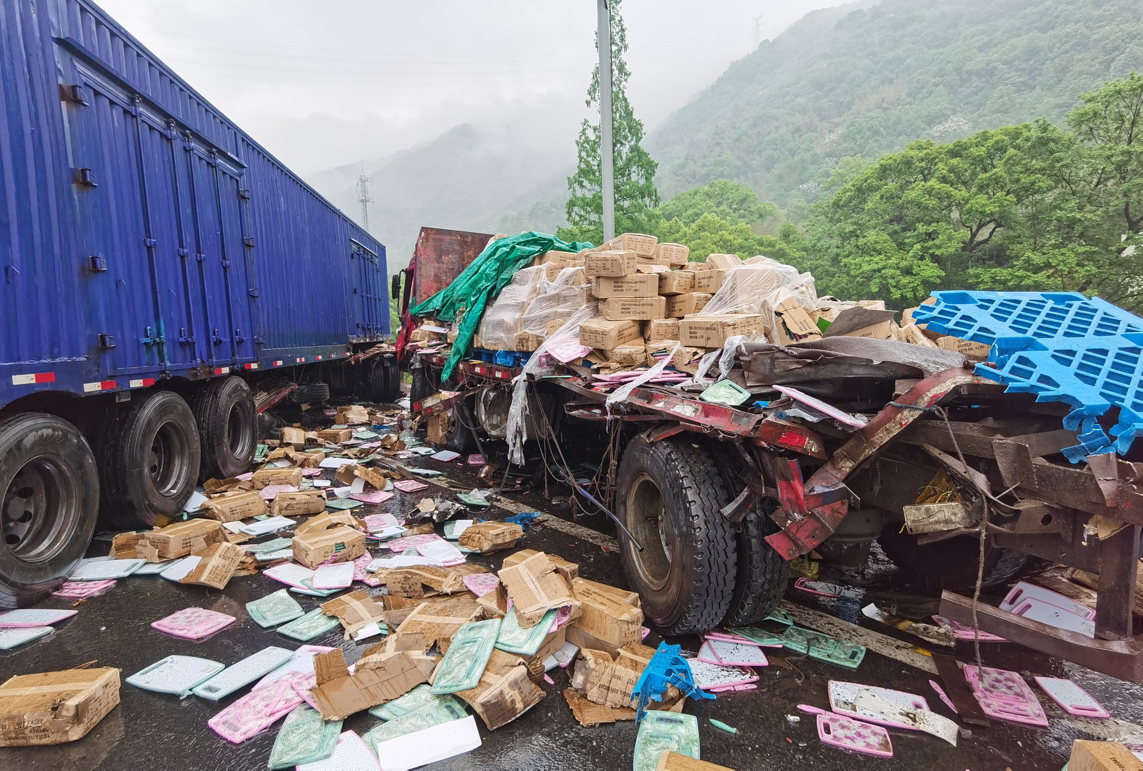 緊急救援!黃土嶺隧道口一輛大貨車避讓不及追尾后撞上護(hù)欄 4月13日上午8點(diǎn)30分左右,天突下大雨,黃土嶺隧道附近傳出一聲巨響,發(fā)生了驚魂一幕。 距離寧向洞口200米處,有一輛14米長(zhǎng)的箱式大貨車避讓不及撞上了一輛平板小貨車,隨即又撞到隔離護(hù)欄,整個(gè)車頭瞬間被撞得七零八碎嚴(yán)重變形,車尾橫向路面且僅留小車能駕駛的空間。被追尾的平板貨車所載貨品散落一地,高速路上、護(hù)欄外一片狼藉,所幸無(wú)人員傷亡,大貨車司機(jī)膝蓋輕微撞傷。