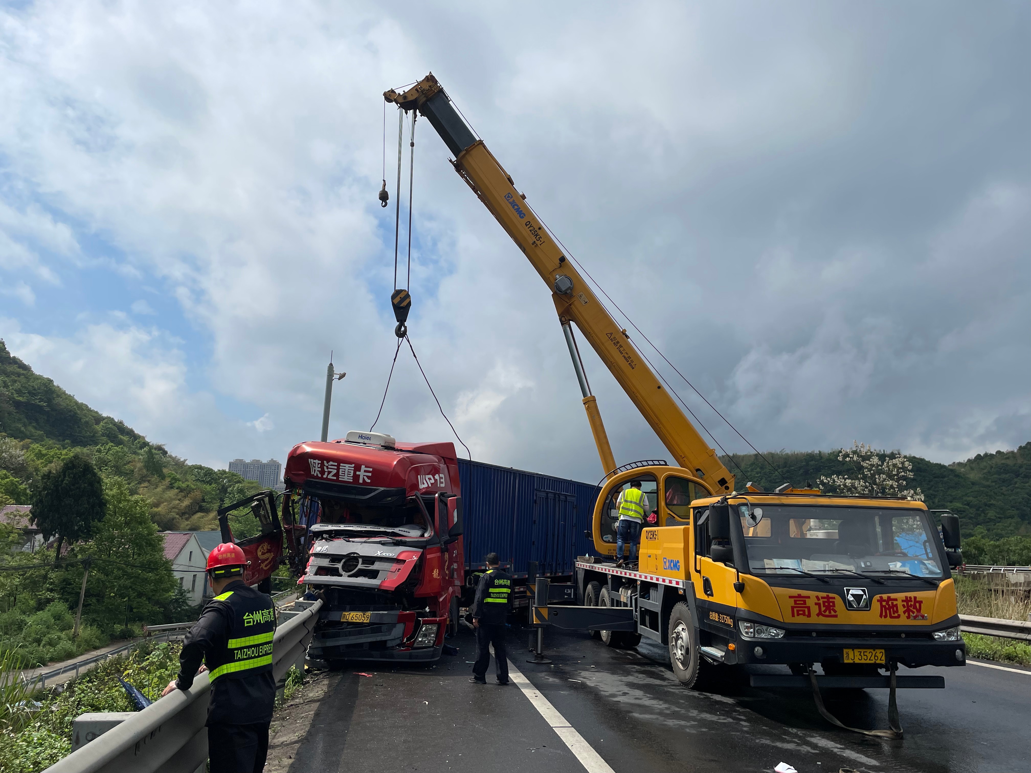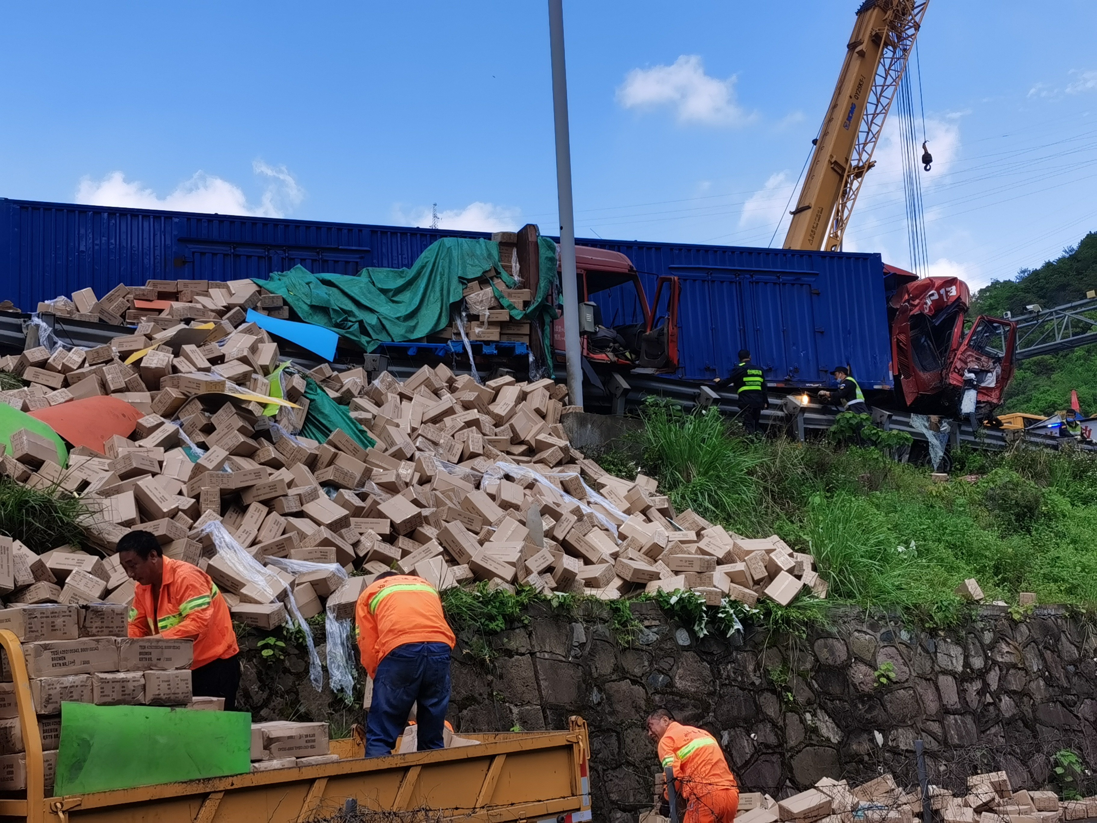 隨后,拖車、救護(hù)車、吊車相繼到達(dá),所有人員立即有序分工,因大貨車車頭卡在護(hù)欄,需要切割,拖車難度較大需要吊車將其拖出,現(xiàn)場(chǎng)救援緊急開展。隧道所工作人員協(xié)助駁貨車清理貨物和散落的車架,保證高速路面通暢。 后經(jīng)詢問(wèn)了解,平板貨車因車輛拋錨停在黃土嶺寧向洞口200米處,雖然已將安全警示牌放在車輛后方,但車輛未完全停靠邊上。后方一輛箱式貨車發(fā)現(xiàn)時(shí)緊急剎車,由于當(dāng)時(shí)正下大雨路面濕滑,緊急制動(dòng)后車輛發(fā)生擺尾失控,司機(jī)急打方向想要救車阻止,但是依然撞上了前方的拋錨貨車。 再次提醒廣大司乘人員,雨天路滑,要控制車速保持車距離,遇車輛拋錨,車靠邊人撤離,并撥打高速救援電話12122。 蔣弓