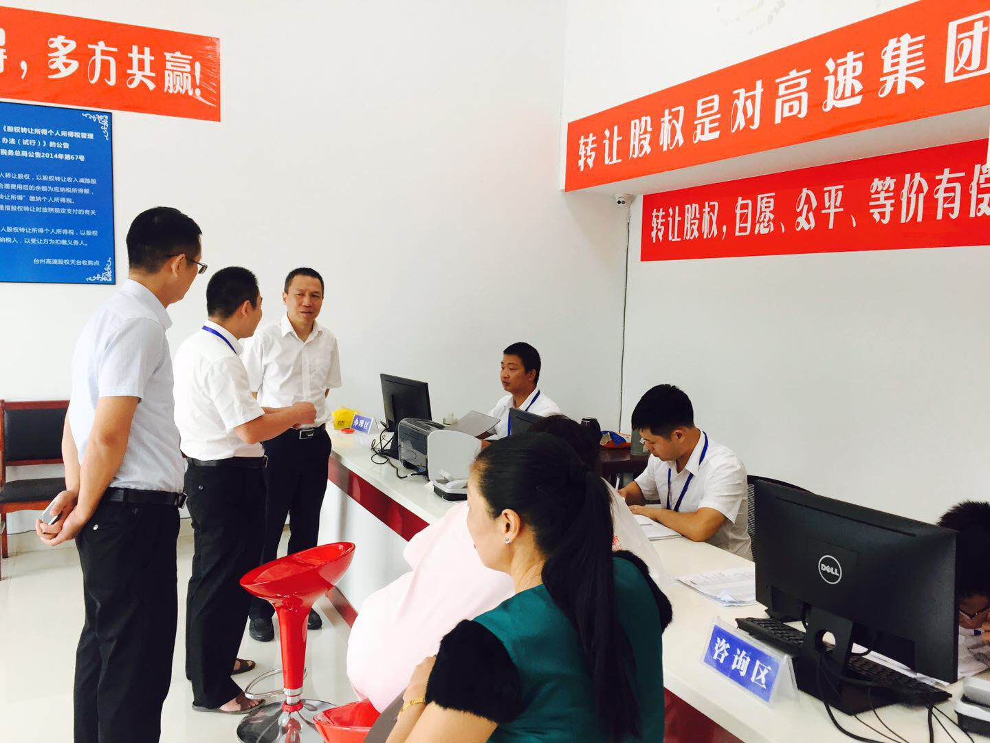 圖為集團(tuán)副董事長(zhǎng)、總經(jīng)理張建平在天臺(tái)收購(gòu)點(diǎn)詳細(xì)詢問收購(gòu)工作具體開展情況 張建平向各地方政府前期對(duì)公司股權(quán)收購(gòu)工作的支持表示感謝,他介紹了當(dāng)?shù)嘏_(tái)州高速股權(quán)收購(gòu)進(jìn)展情況,同時(shí)闡明收購(gòu)工作中存在的困難,需要地方政府繼續(xù)對(duì)我們的工作給予支持和幫助。三地政府都表示一定會(huì)全力支持這項(xiàng)工作。仙居縣分管公司股權(quán)收購(gòu)的常務(wù)副縣長(zhǎng)說,“放心吧,我們一起想辦法,先從持股較多的法人股入手,再化大力氣做小股東工作,一定會(huì)圓滿完成任務(wù)。” 張建平一行先后來到三地股權(quán)收購(gòu)點(diǎn),向收購(gòu)一線的工作人員表示親切的問候。張建平對(duì)大家的工作給予肯定,感謝所有人勤勤懇懇,無私付出,并希望大家繼續(xù)努力,共同實(shí)現(xiàn)目標(biāo)。工作人員詳細(xì)介紹了日常具體工作方法,他們緊跟公司股權(quán)收購(gòu)總體布局,并結(jié)合當(dāng)?shù)靥厥馇闆r,因地制宜,有序靈活地開展股權(quán)收購(gòu)工作。
