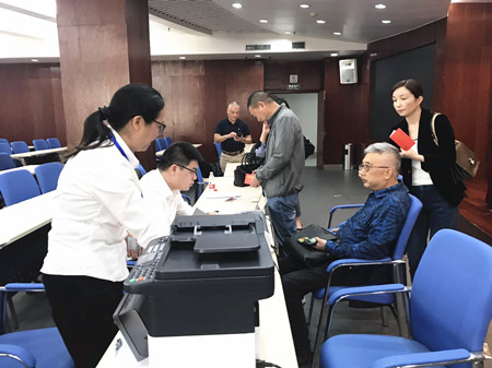 上圖為工作人員在溫嶺市政府設(shè)置流動點為股東服務(wù)