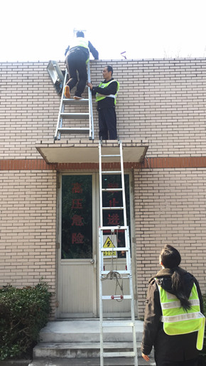 圖為執勤人員清理屋頂雜草和塵土