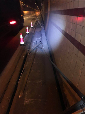 “南廣場有大貨車報警,據說發生事故……”4月17日凌晨3時55分,大溪嶺隧道中控室接到了臺州監控中心緊急來電,執勤隊立即驅車趕赴現場查勘。 巡邏車到達南廣場后,執勤隊員發現溫向隧道進洞1公里處,隧道頂部的攝像頭被撞損,造成電纜橋架移位,電纜下垂橫跨車道,存在嚴重安全隱患。事發突然,執勤隊員立刻做好安全預警措施,同時聯絡集團工程養護部機電維養中心,請求支援開展緊急搶修。