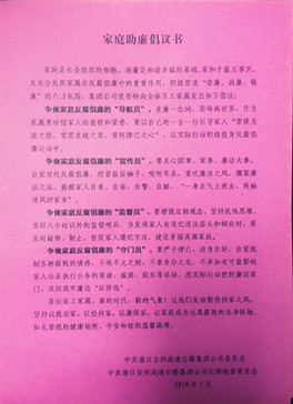 為充分發(fā)揮員工家庭成員在黨風(fēng)廉政建設(shè)中監(jiān)督預(yù)防的特殊作用,根據(jù)集團(tuán)“廉政教育月”活動(dòng)要求,5月30日,監(jiān)察室向全體員工發(fā)放了一封以“傳承好家風(fēng),共建廉之家”為內(nèi)容的《家庭助廉倡議書》,讓廉潔文化走進(jìn)家庭,成為家庭美德,更好地發(fā)揮家庭成員在廉政建設(shè)中的特色作用。