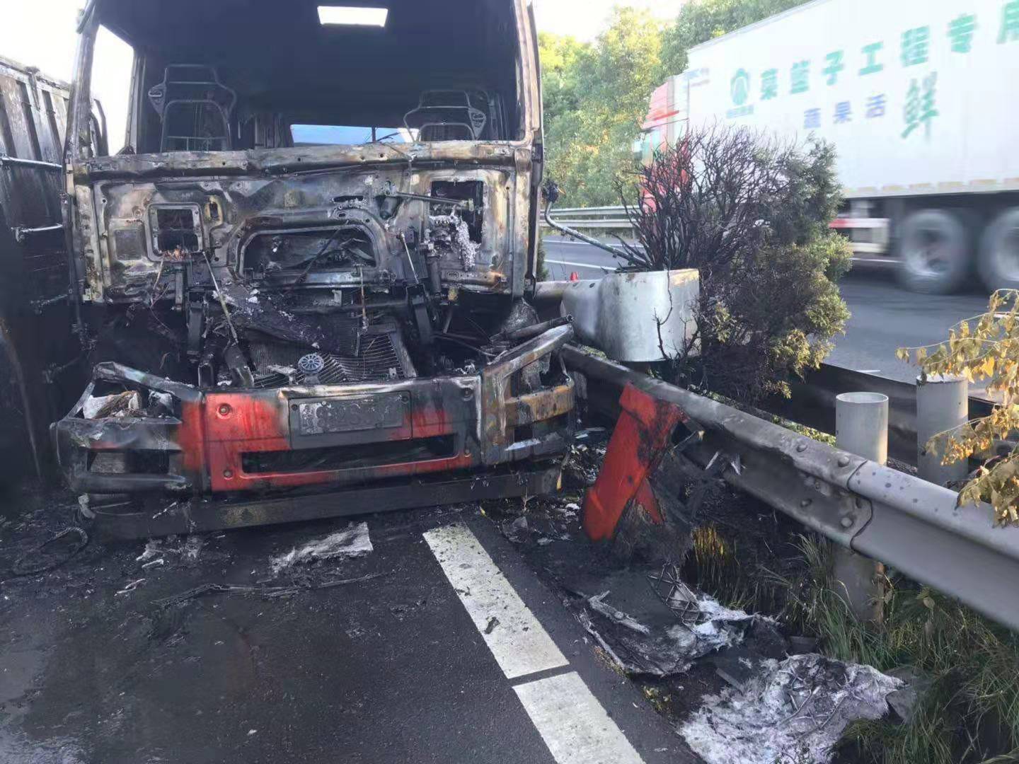 大火在現(xiàn)場留下了幾乎成為殘骸的兩輛車、滿地的油污、車輛碎片、燒剩下的布匹,一股刺鼻的臭味一公里外都聞得到。油污讓路道變得又膩又滑。更為嚴(yán)重的是,隨著時間的推移,從事故點開始,堵車開始一公里一公里的蔓延,幾乎快到了臺州收費所。
