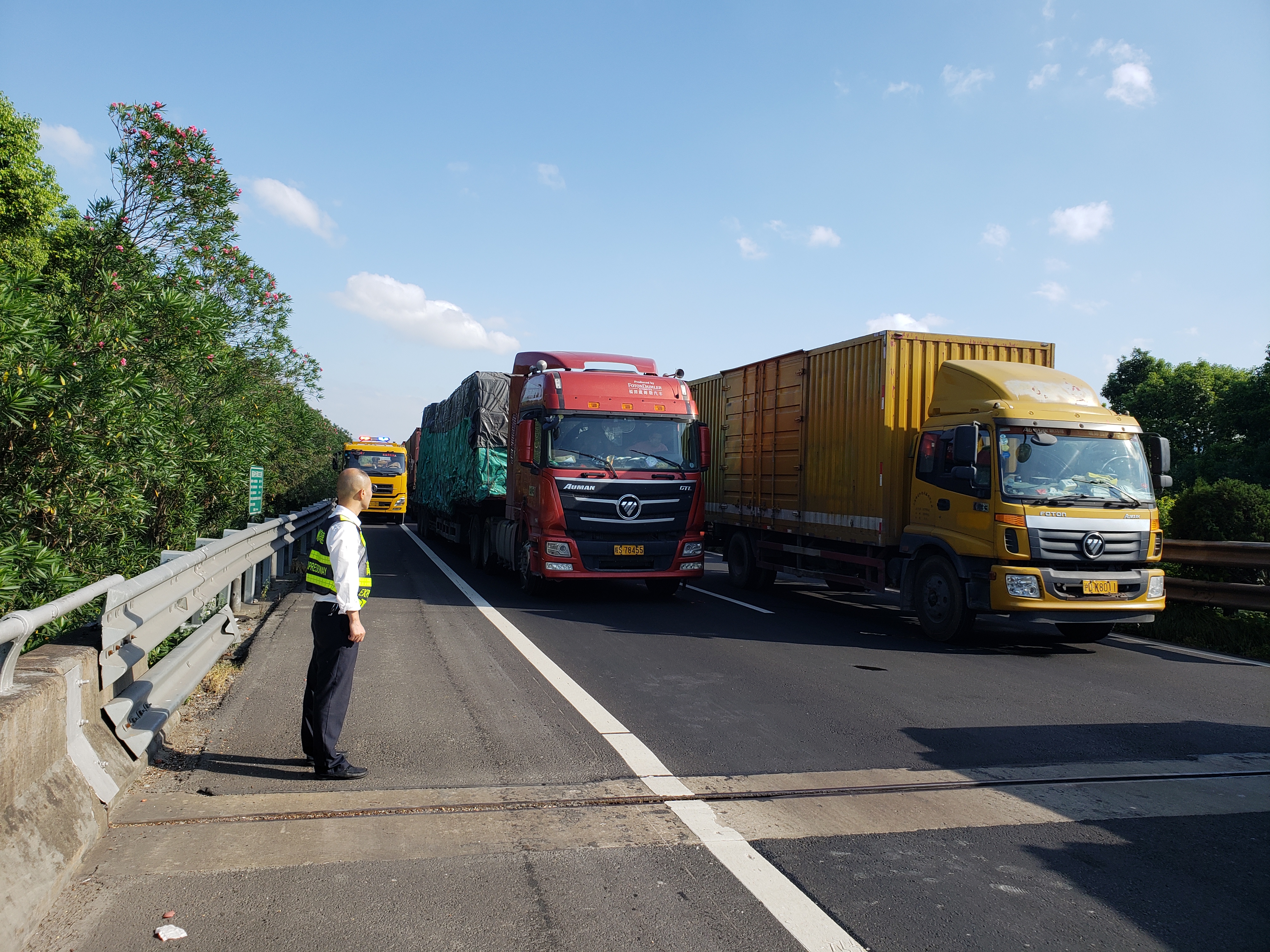 時間已經(jīng)過去了2個多小時,堵車達(dá)到了十多公里,盡管當(dāng)天的駕駛員都極有素質(zhì),沒有占用硬路肩,但大型救援車僅僅硬路肩還是不夠,還需要占用一部分主車道。每到開不過去的地方,毛慶榮就下車指揮前后車輛往超車道靠。