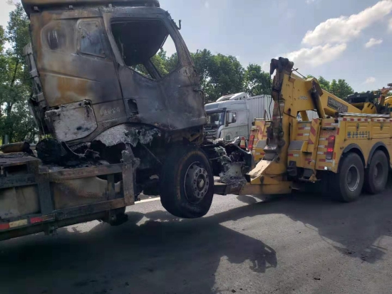 接到通知,凌晨4點剛救援了一輛拋錨車的駕駛員潘志平和輔查員童志敏火速趕往現(xiàn)場。盡管一夜的忙碌讓他倆的臉上寫滿了疲倦,但還是義無返顧地參與救援。