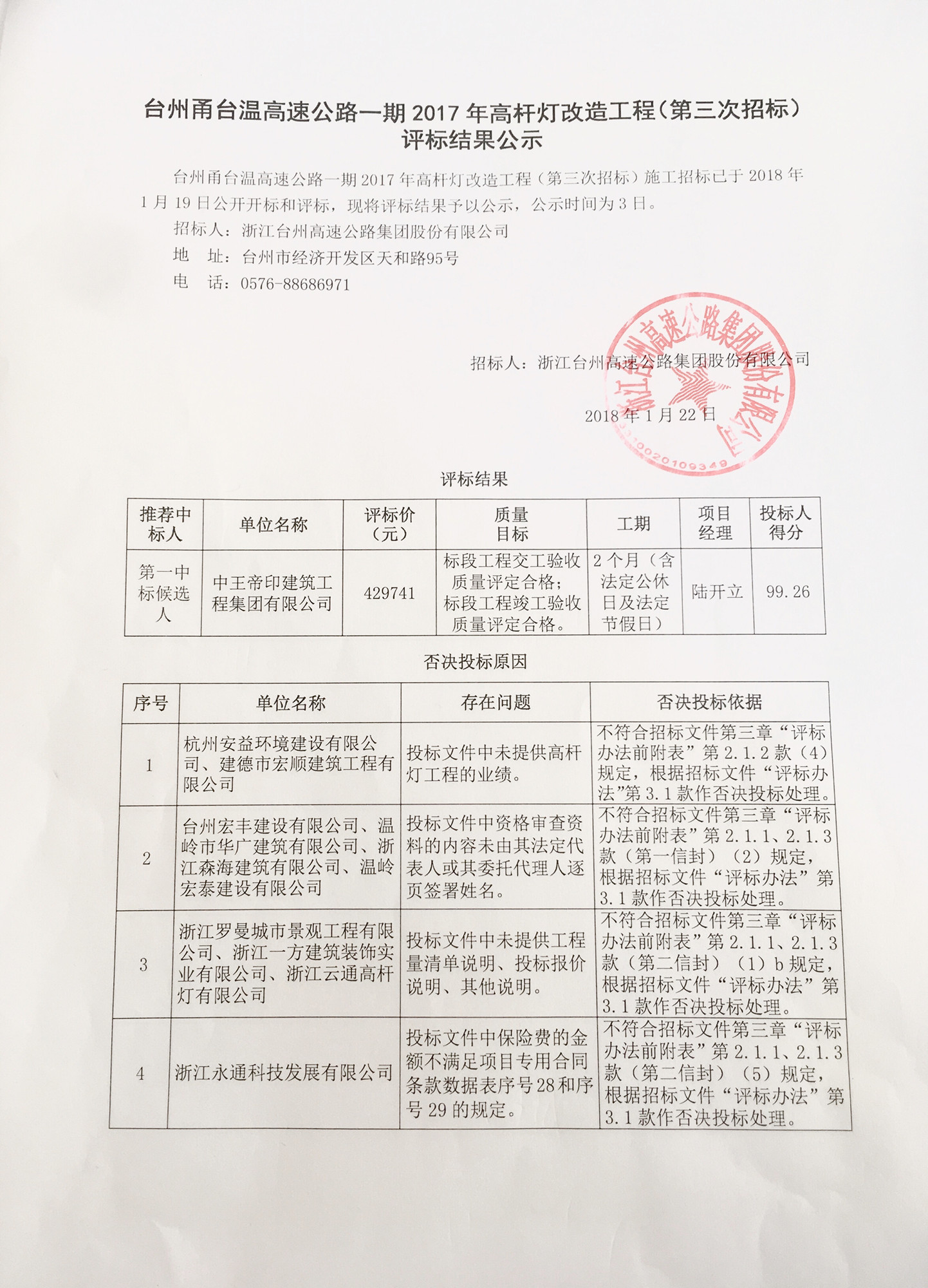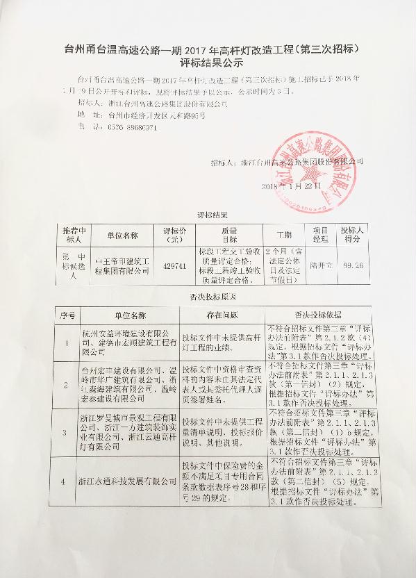臺州甬臺溫高速公路一期2017年高桿燈改造工程(第三次招標(biāo))評標(biāo)結(jié)果公示