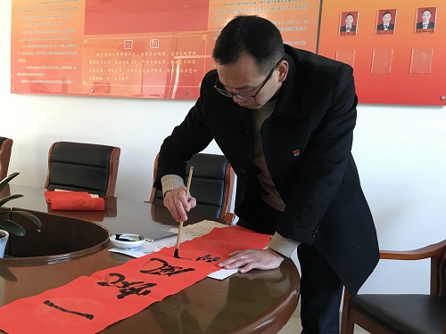 上聯“自強不息吉慶到”、下聯“厚德載物福運來”,橫批“喜迎新春”,個個遒勁有力的大字從筆尖輕快地躍出,行云流水的書法讓在場人員無不拍手叫好。所長孫明偉亮出絕活,揮毫潑墨,豪邁大氣地揮寫著一幅幅春聯。