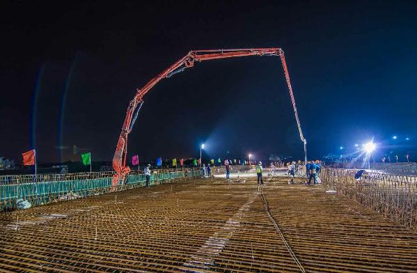 圖為4月21日凌晨,內環路8#立交第二聯箱梁頂板澆筑場景。鐘 彪攝